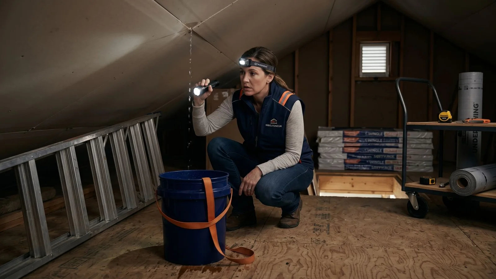 A step-by-step plan for what to do in the first 30 minutes when a roof starts leaking in the middle of the night — protect the home, document, and dry-in.